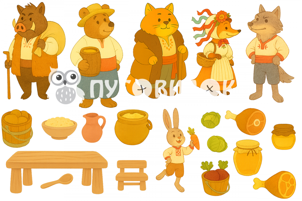 Усі персонажі намальовані дитячим художником, з урахуванням особливостей сприймання малюнка дитиною та національної традції у костюмах персонажів.