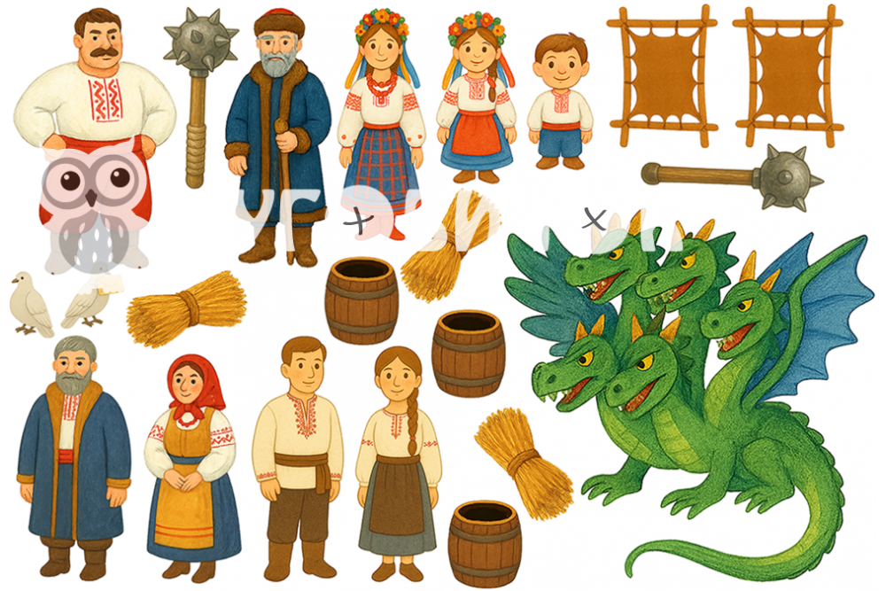 Усі персонажі намальовані дитячим художником, з урахуванням особливостей сприймання малюнка дитиною та національної традції у костюмах персонажів.